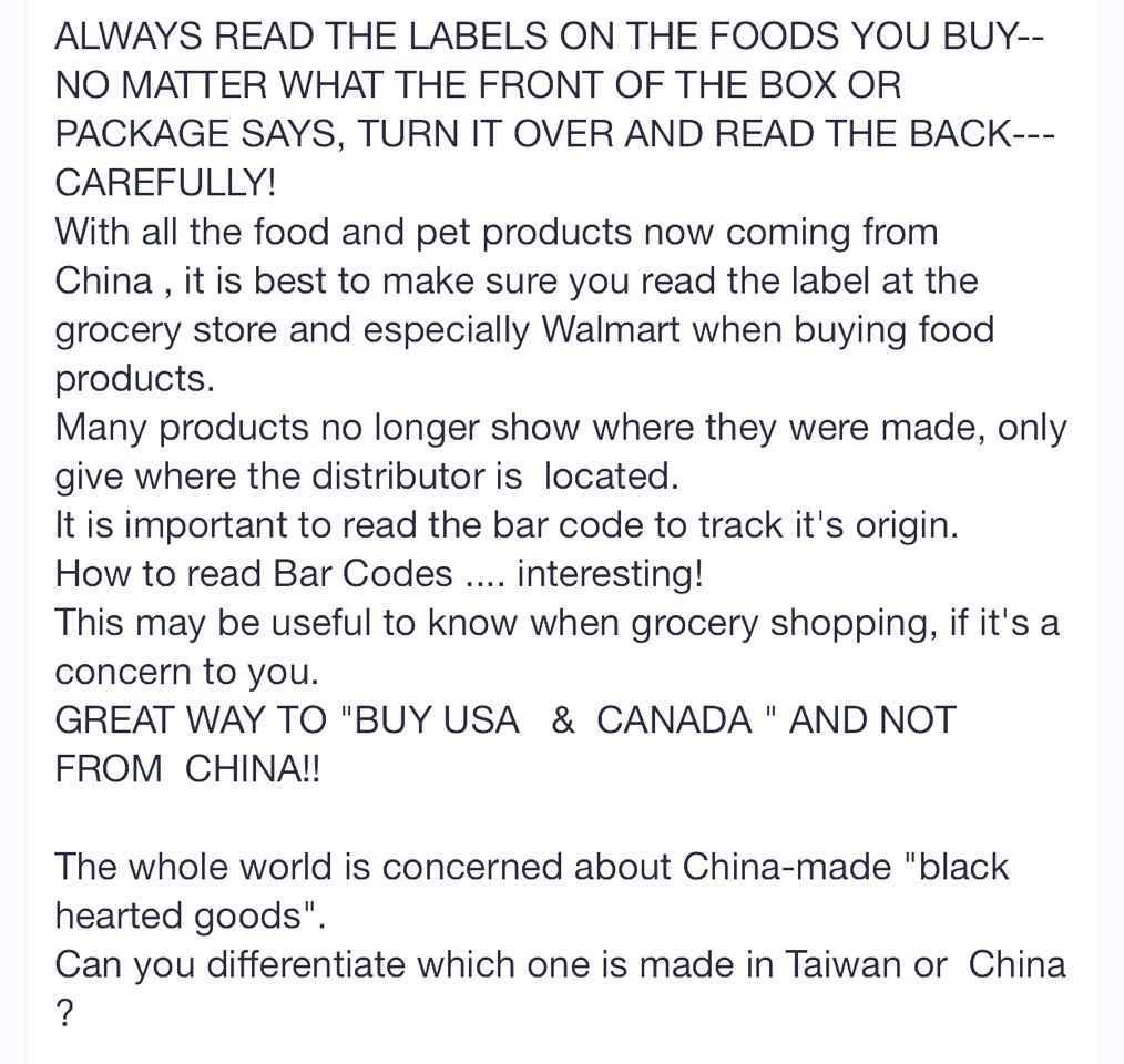 Fact Check: A Barcode Does NOT Tell You A Product's ... - Lead Stories ALWAYS READ THE LABELS ON THE FOODS YOU BUY--NO MATTER WHAT THE FRONT OF THE BOX OR PACKAGE SAYS, TURN IT OVER AND READ THE BACK---CAREFULLY! With all the food and pet products now coming from China , it is best to make sure you read label at the grocery store and especially Walmart when buying food products.