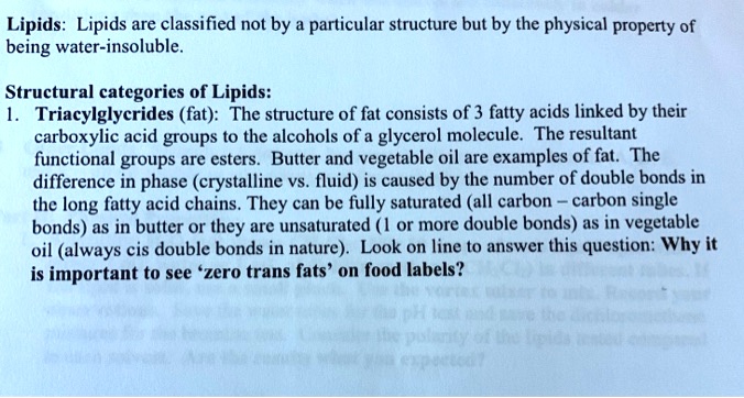 Lipids - Nutrition Essentials - Maricopa Understanding Food Labels and Health Claims. 6. Essential Nutrients. 7. The Process of Digestion and Absorption. 8. Carbohdyrates. 9. Lipids. 10. Protein. 11. Food Allergies. 12. Vitamins. ... Lipids are important fats that serve different roles in the human body. The three main types of lipids are triacylglycerols (also known as triglycerides ...